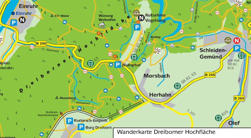Erlebnis-Tipps Dreiborner Hochfläche Jeden Sonntag um 13 Uhr führen die Ranger der Nationalparkverwaltung über die Dreiborner Hochfläche. Ausgehend vom Kulturkino vogelsang ip führt die dreistündige Route entlang des Neffgesbachs bis Wollseifen. Nach etwa 6,5 Kilometern mit einem steilen Anstieg endet die Wanderung am Ausgangspunkt auf Vogelsang. Am Spielplatz in Erkensruhr ist jeden Freitag um 11 Uhr Treffpunkt für eine weitere Ranger-Führung. Länge, Dauer und Strecke werden hier in Abstimmung mit den Teilnehmerinnen und Teilnehmern festgelegt. Die Tour führt Sie entweder auf die schmalen Wege des Dedenborner Buchenwaldes oder auf das Offenland der Dreiborner Hochfläche. Die neue Rothirsch-Aussichtsempore in Dreiborn ermöglicht insbesondere zur Brunftzeit zwischen Mitte September und Mitte Oktober ein Naturerlebnis der besonderen Art. Mit etwas Glück und Geduld können Sie vor allem in den Abend- und Morgenstunden die imposanten Rothirsche, Mitteleuropas größte freilebende Wildtiere, in ihrem natürlichen Lebensraum beobachten. Auch die Brunftschreie der Hirsche zur Paarungszeit sind ein Erlebnis. Mit Fernglas und Sitzkissen sind Sie bestens gerüstet – allerdings dürfen die Tiere nicht gestört werden, daher ist absolute Ruhe wichtig. Der Parkplatz “Rothirsch-Empore” in Dreiborn ist ein guter Ausgangspunkt für Gäste, die mit dem PKW anreisen. |