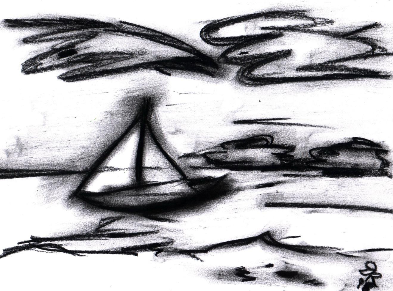 Kohlezeichnung Wischtechnik Domicia Sailboat Segelschiff mit Fledermaus und Taube in Kohle