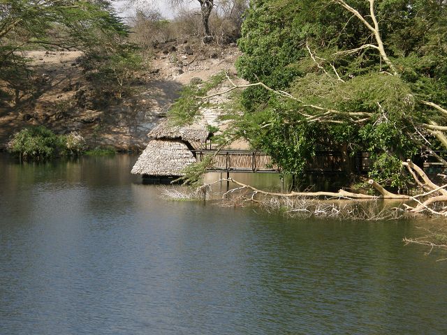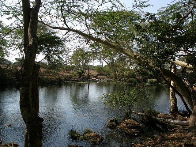 | Mzima Springs.Mitten der trockenen und heißen Savanne liegt ein Waldgebiet, dessen Mittelpunkt zwei glasklare Quellteiche bilden. Gespeist werden diese Oasen durch unterirdische Flussläufe, die das Schmelzwasser des Kilimanjaro heranführen. | In der Minute sprudeln bis zu 280.000 Liter aus den Mzima Springs. Ein grosser Teil wird als Trinkwasser per Pipeline nach Mombasa geleitet . |