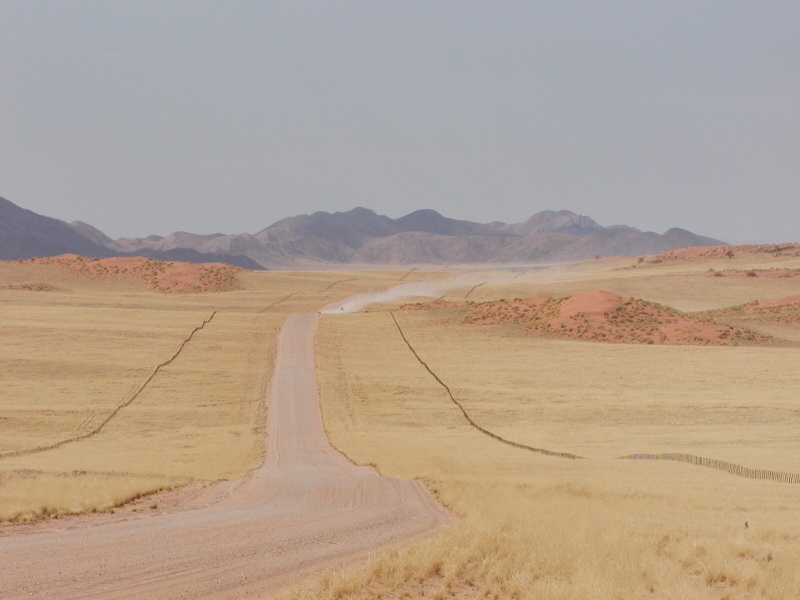 immer geradeaus Gegenverkehr in 10 Minuten Weiten des Farmlandes am Rand der NamibWüste