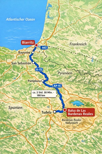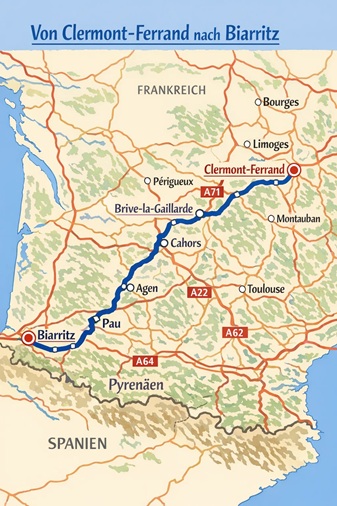 bis Clermont Ferrand Von Biarritz nach Ahetze, 64210, Frankreich dann Tudela, 31500, Navarre, Spanien bardenas reales dann Bilbao San Julián de Muskiz, 48550, Bizkaia, Spanien dann Santander mit Stadtbesichtigung dann Santa Cruz del Sil, 24494, León, Spanien |