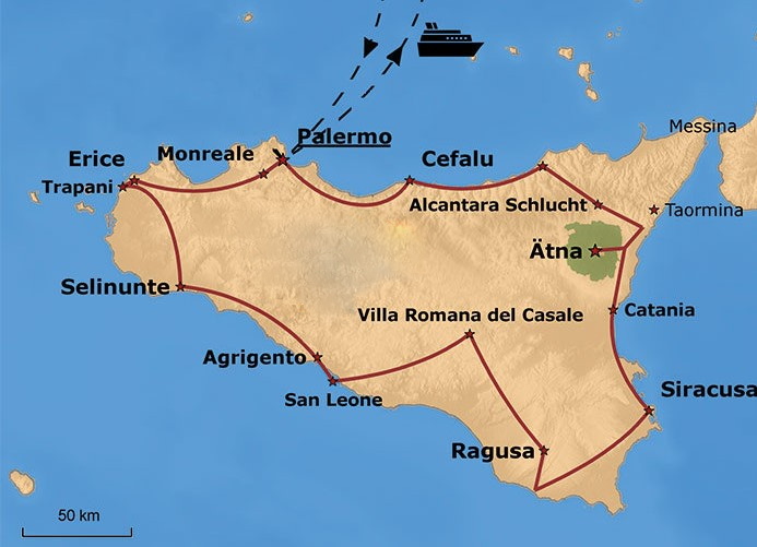 im Meer Palermo Monreale Erice Trapani Selinunte Agrigento San Leone Villa Roma del Casal Ragusa Siracusa Catania Ätna Alcantara Schlucht |
