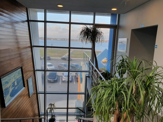 befindet sich das Restaurant im ersten Stock eines modernen Gebäudes mit