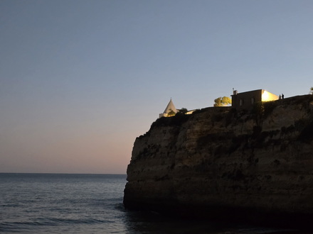 | Praia Rocha mit der Kapelle auf der Klippe | eremita Branco weisse kapelle |