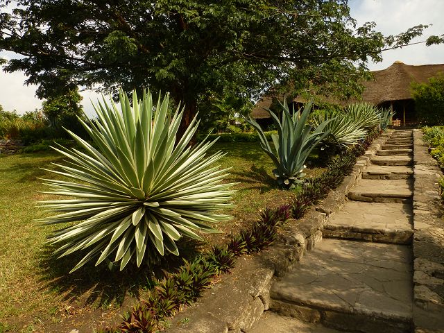 sowie die tropischen Pflanzen und Bäume auf dem Gelände sorgen für eine