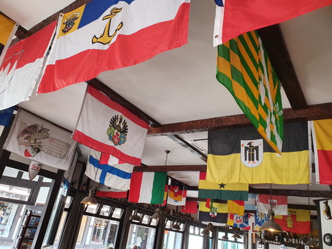 Verziert im typisch bayerischen Stil, mit Erinnerungsstücken und Fahnen