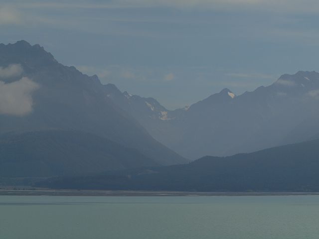 moraine reservoirs. The lake is 8 km wide and 15 km long. Lake Pukaki is fed at its northern end by the much-publicized Tasman River and the Hooker River. The rivers draw their water in part from the melting Tasman Glacier and Hooker Glacier, which are located near Mt. Cook / Aoraki in the eastern Southern Alps. The total catchment area for Lake Pukaki is approximately 1,355 square kilometers. |