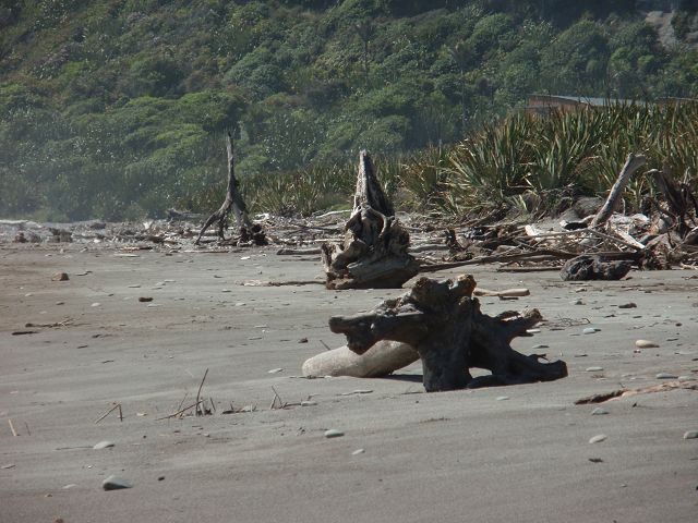 Ende des Punakaiki Beach, 300 m südlich der Pancake Rocks, mit Panoramablick