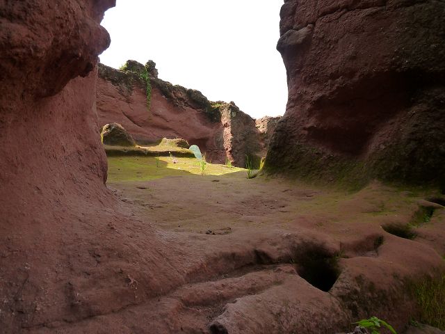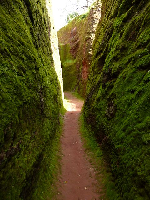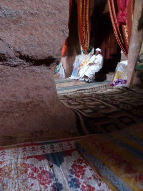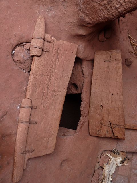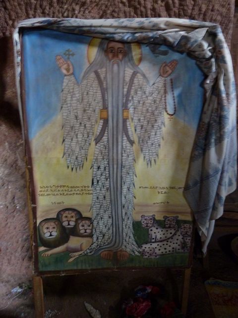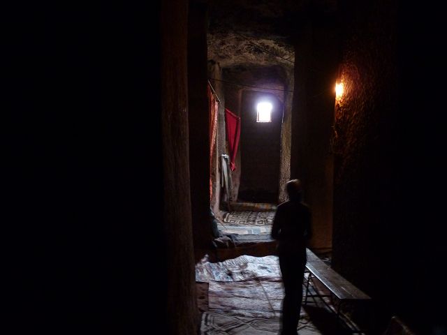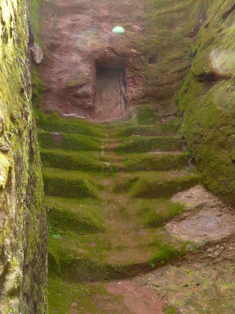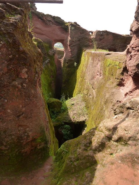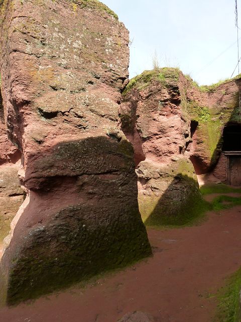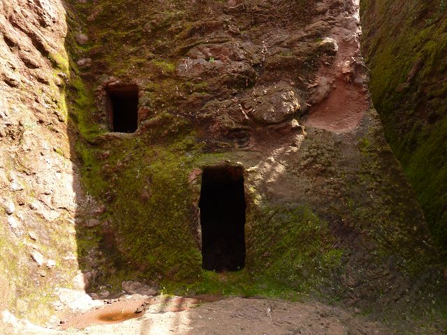 Eisenfesseln, die in den umliegenden Graben eingelassen sind. Diese Höhlenkirche ist Mercurios gewidmet, einem koptischen Heiligen aus dem 3. Jahrhundert, der wegen seines christlichen Glaubens von Kaiser Decius gefoltert und enthauptet wurde und ein Jahrhundert später eine Hauptrolle beim Tod des abtrünnigen Kaisers Julien spielte. Die Kirche ist baufällig, der Eingang wurde wieder aufgebaut und das Innere ist verblasst, aber der Zugang durch einen 35 Meter langen unbeleuchteten Tunnel von Bet Babriel-Rafeal aus ist bemerkenswert. Er wird ohne Fackel durchschritten und ist eine weitere Glaubensprüfung, auf die sich die Äthiopier spezialisiert haben. Man sagt, dass er eine Passage durch die Hölle nachahmt, die in das Licht der Kirche führt. |