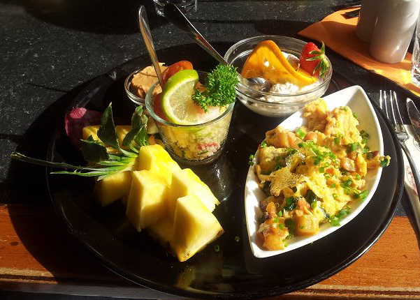 afrikanisches Frühstück Rührei mit Fladen + Couscous mit Shrimps + frische Ananas + Kokosquark | Mittag Mainmühle |