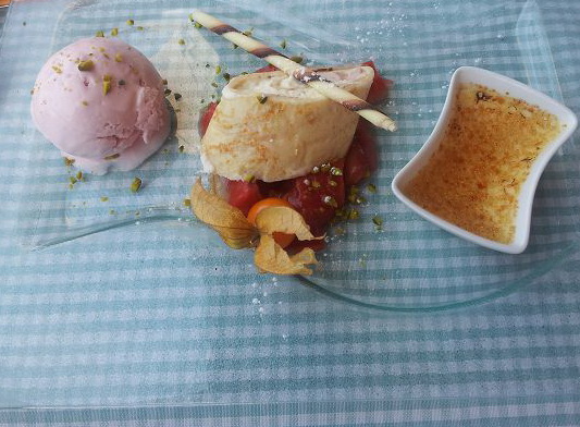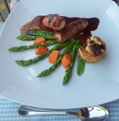 Rebhuhn im Speckmantel mit Kartoffelbaumkuchen | Himbertsorbeteis mit Spargelbrulee + frischer Rabarber |