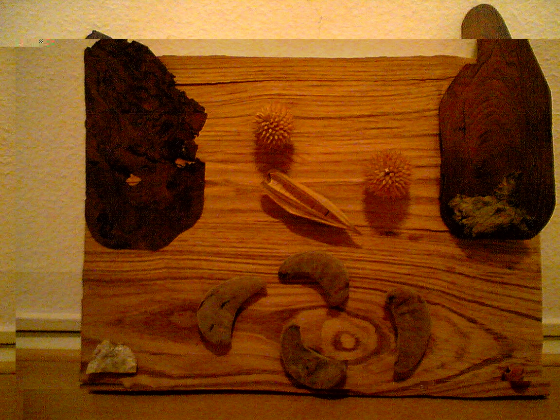 Mokoro zwischen tanzenden Flusspferden Collage mit Kameldornakaziensamenhülsen , Kameldornworzel, Rosenwurzelholzfurier Armarulanuss mit Mausbißloch , etc |