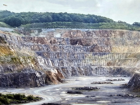 Strassenterassen im Kalkbruch | Rotfärbung der Gesteinsschichten durch Hämatit |