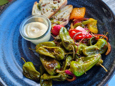 Piementos de Padron Pimientos de Padrón | Kalamata Oliven | Röstbrot | Dip 12 Pimientos de Padrón | Kalamata Olives | Roasted Bread | Dip | Loup de Mer Loup de Mer | Auberginen Salsa | Zucchini Gemüse | Kartoffelstampf 31 Loup de Mer | Eggplant Salsa | Zucchini Vegetables | Mashed Potatoes | |