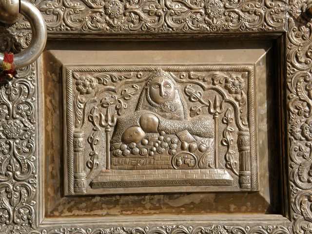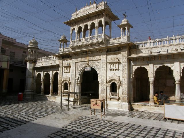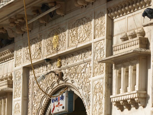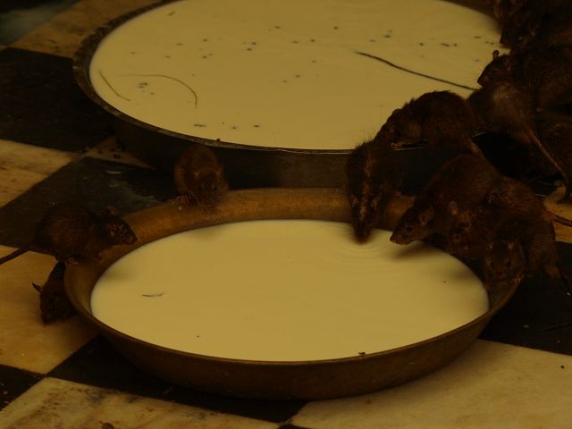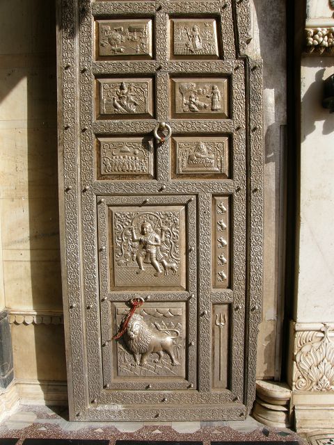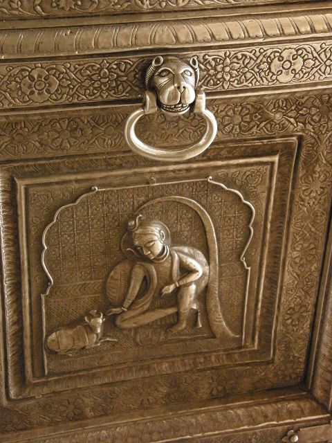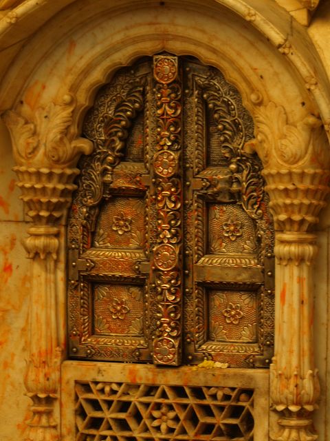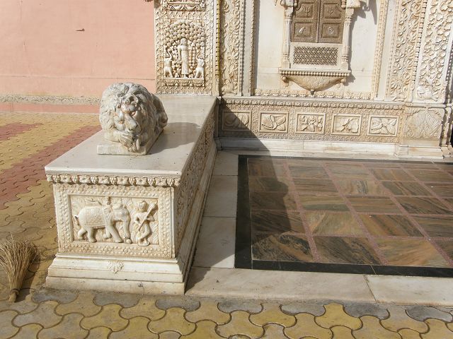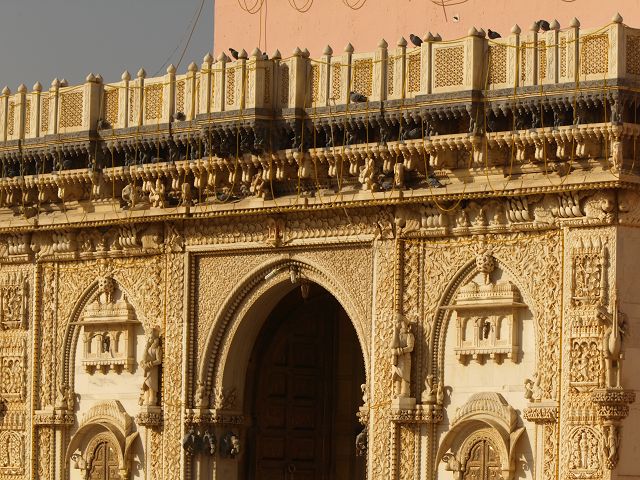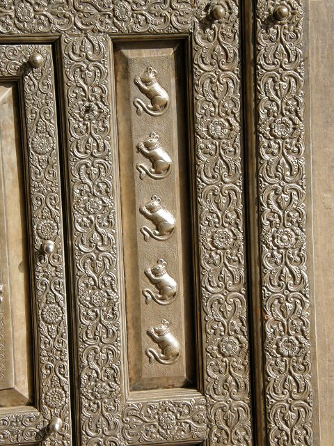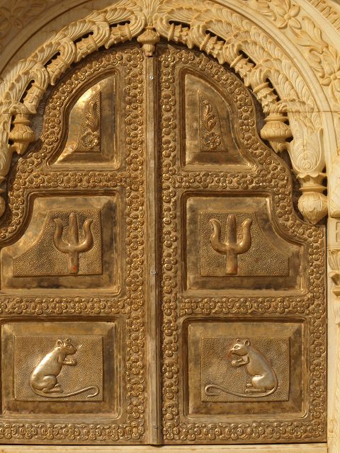 immer wieder die begehrte Selbstbestätigung. Das genaue Alter des Tempels ist unbekannt, aber bereits sehr früh wurde Karni Devi zur Schutzheiligen des Herrscherhauses, das denn auch beträchtliche Mittel für die Gestaltung des Baus zur Verfügung stellte. So ist der aus weisem Marmor gefertigte Zugang zum Tempel komplex mit fein gearbeiteten Figuren hinduistischer Gottheiten versehen, und die silberbeschlagenen Türen, die Maharaja Ganga Singh (1887-1943) stiftete, zeigen vollendete Handwerkskunst. Im Allerheiligsten steht eine aus Jaisalmersandstein geformte Figur von Karni Devi unter einem goldenem Baldachin. |