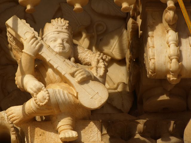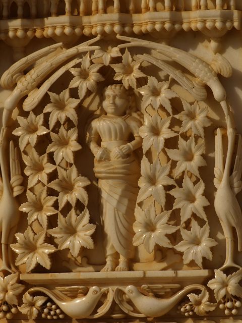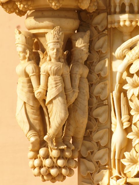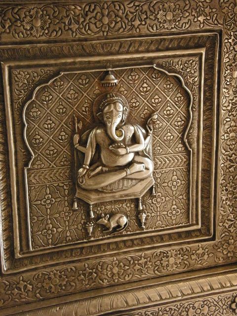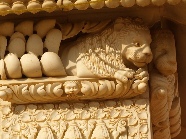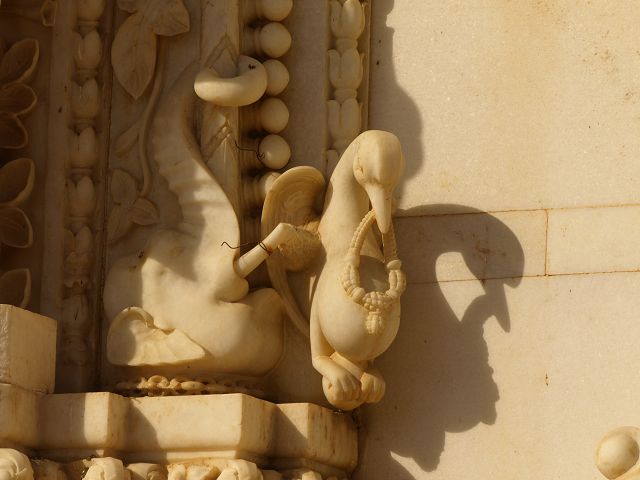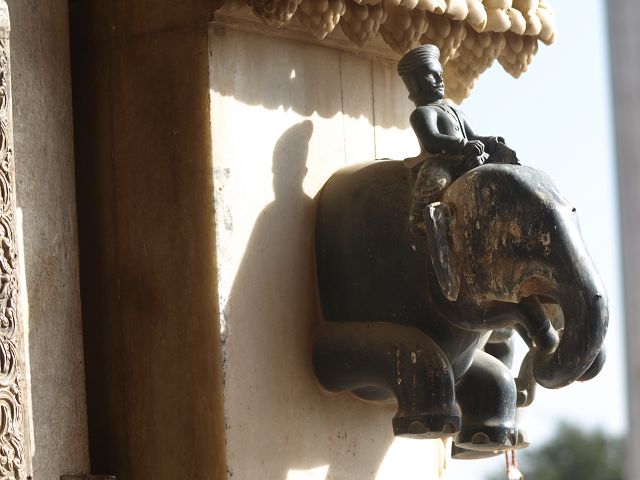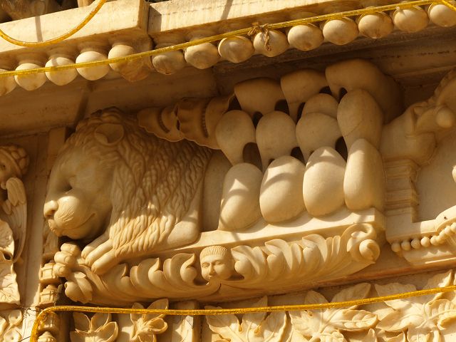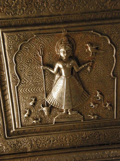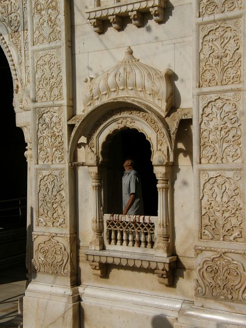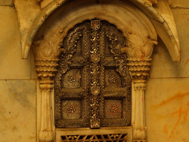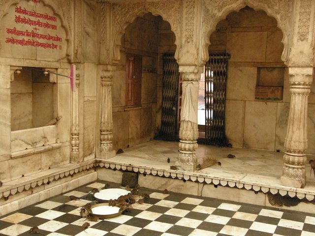 immer wieder die begehrte Selbstbestätigung. Das genaue Alter des Tempels ist unbekannt, aber bereits sehr früh wurde Karni Devi zur Schutzheiligen des Herrscherhauses, das denn auch beträchtliche Mittel für die Gestaltung des Baus zur Verfügung stellte. So ist der aus weisem Marmor gefertigte Zugang zum Tempel komplex mit fein gearbeiteten Figuren hinduistischer Gottheiten versehen, und die silberbeschlagenen Türen, die Maharaja Ganga Singh (1887-1943) stiftete, zeigen vollendete Handwerkskunst. Im Allerheiligsten steht eine aus Jaisalmersandstein geformte Figur von Karni Devi unter einem goldenem Baldachin. |