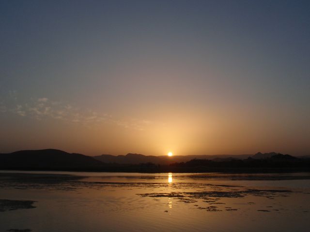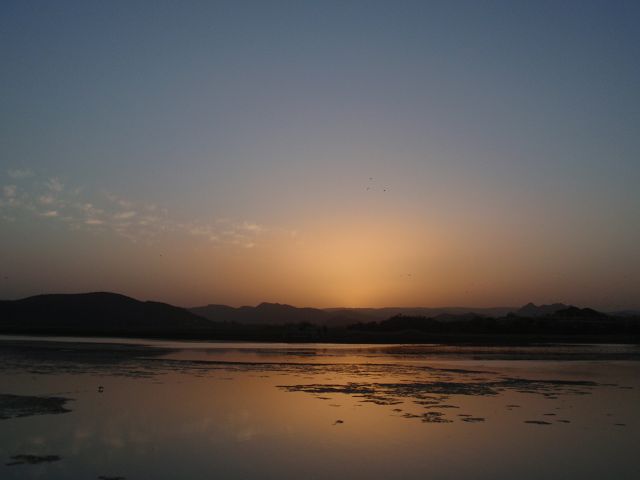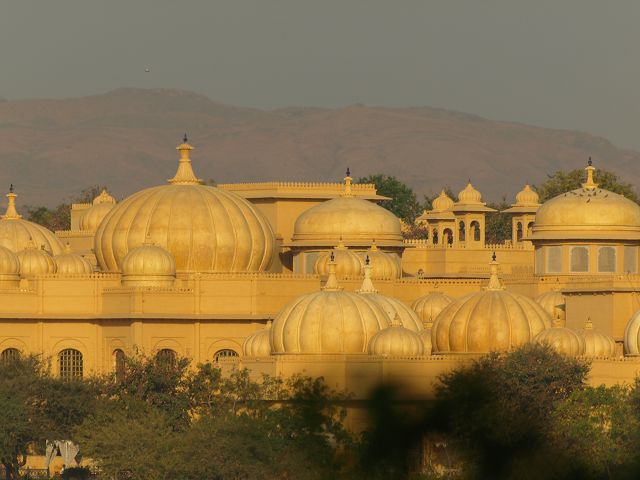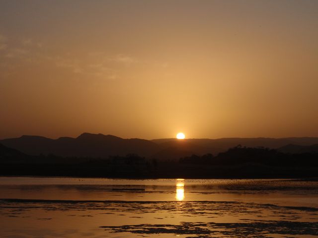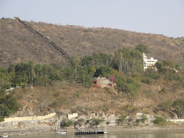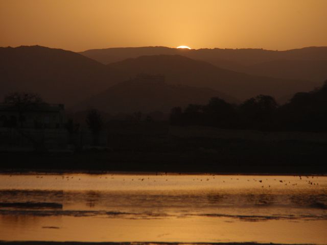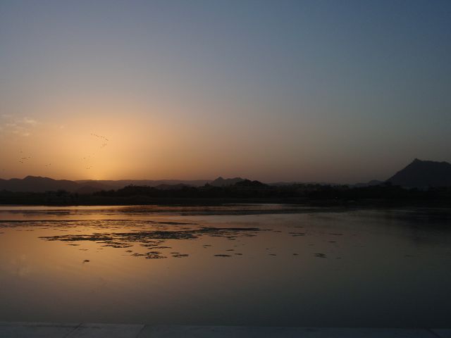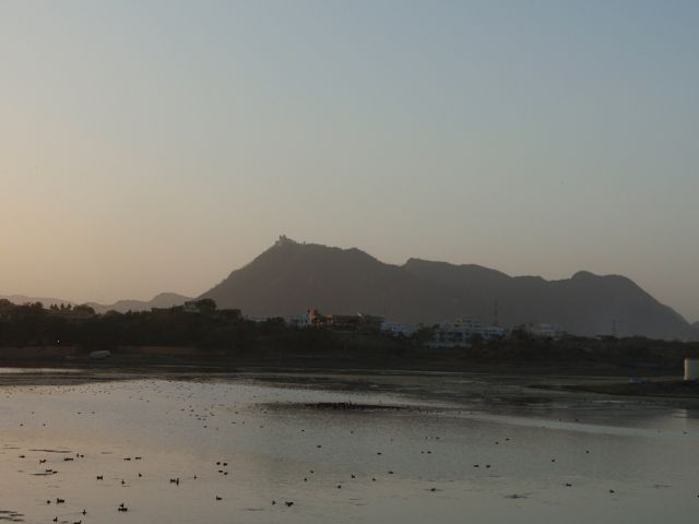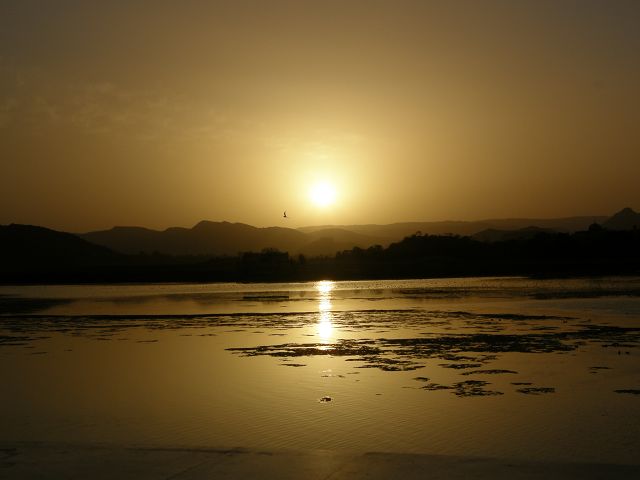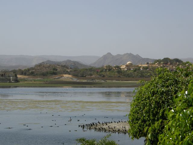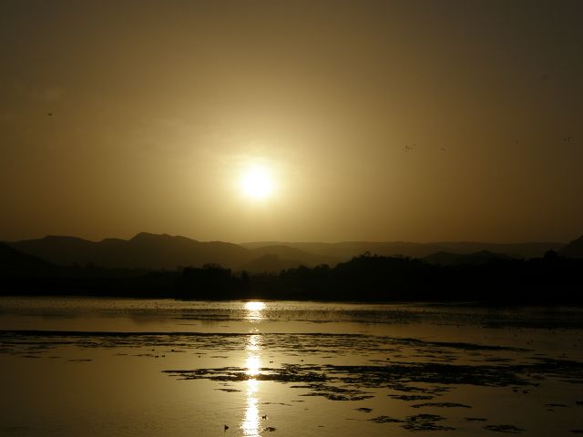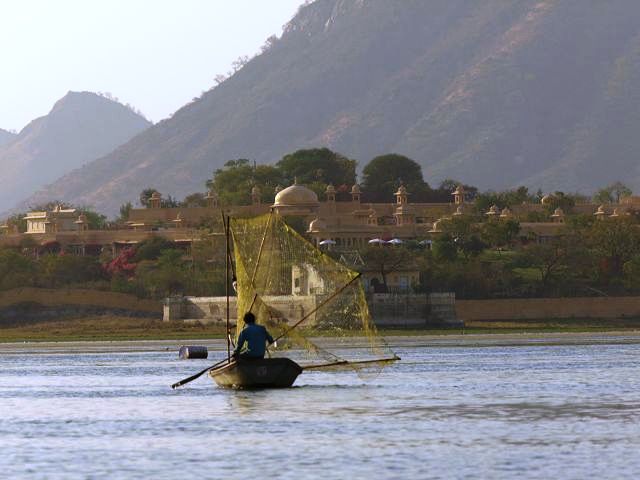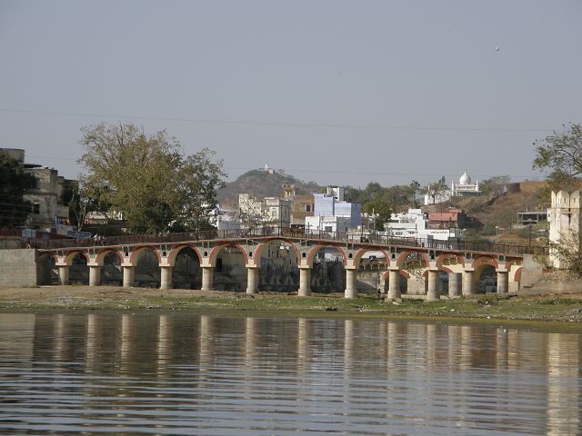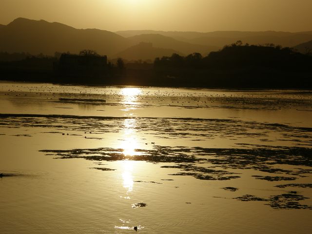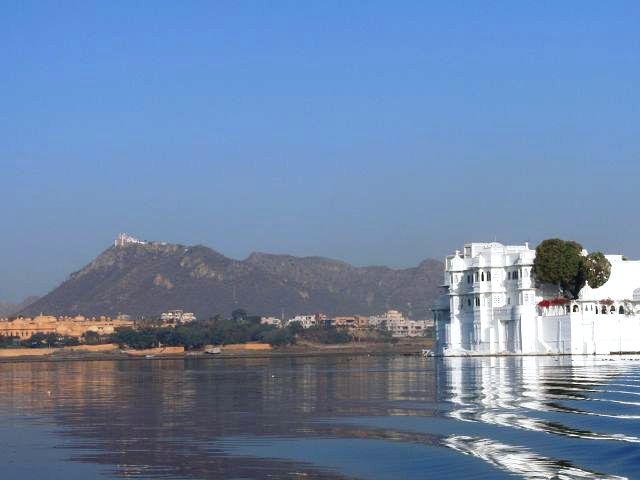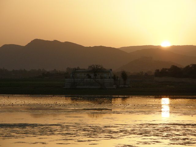 Picholasee Auf dem Pichola-See kann man die Lustinsel Jag Mandir erblicken Die schöne Gegend am See, die Maharana Udai Singh für seine Hauptstadt auserkor, bildet einen krassen Unterschied zu den zerklüfteten Höhen Chittaurgarhs. Maharana Udai Singh ließ den See vergrößern, der Wasser von bis zu 160 km entfernten Bergen aufnahm und sich heute über eine Fläche von 8 km erstreckt. Um Überschwemmungen in der Monsunzeit vorzubeugen, fügten spätere Herrscher Dämme und Kanäle hinzu. | Picholasee Der Pichola-See, vor einer idylischen Bergkette gelegen, bietet die ideale Kulisse für die vielen Bauten der Maharanas im und um den See. Die beiden Inseln im See, die von den elfenbeinfarbenen Kuppeln und Bögen privater Paläste gekrönt werden, sind Udaipurs bekanntestes und fotogenstes Motiv. Auf der größeren von beiden steht der unter der Regentschaft Jagat Singhs (1628-52) als Sommerpalast errichtete Jag Niwas, das heutige Lake Palace Hotel. |