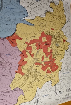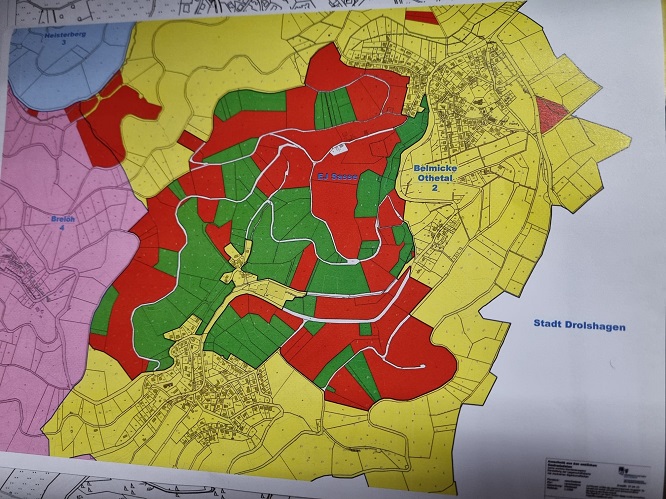 Revier Belmicke Othetal 460 ha davon rot 75 ha Zwergstalbauer grün 60 Ha zupachten sonst nicht bejagbar Restflächen gelb in unseren Augen nicht sinnvoll bejagbar Bild OBK |